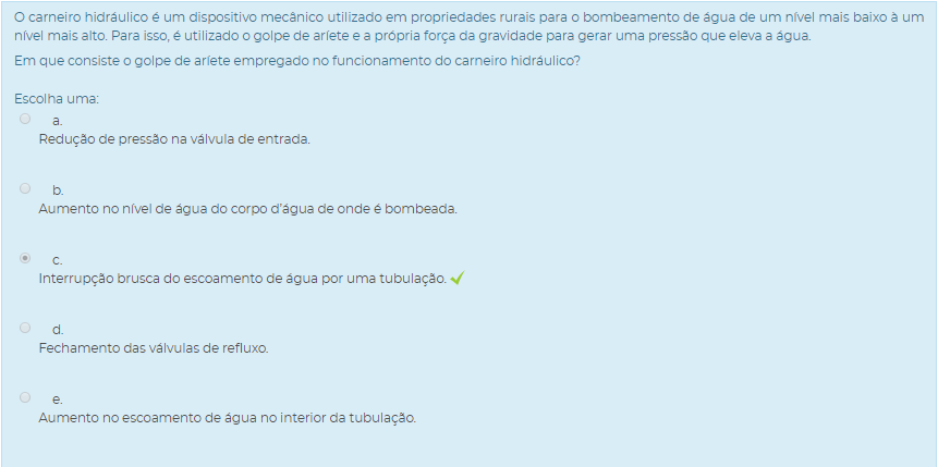 I. Uma das vantagens do uso do carneiro hidráulico é que não é necessária a existência de queda d’água para o seu funcionamento.