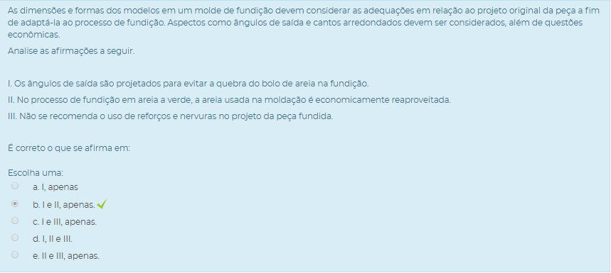Entre as vantagens de se utilizar moldes de areia em processos de fundição podemos citar:I. Suportam altas temperaturas e, portanto, podem ser utilizados para fundição de aços.