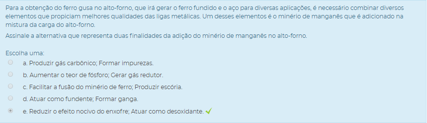 Assinale a alternativa que representa duas finalidades da adição do minério de manganês no alto-forno.