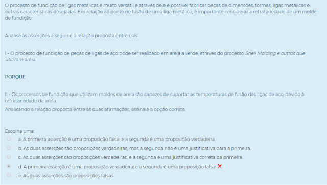 2) O processo de fundição de ligas metálicas é muito versátil e através dele é possível fabricar peças de dimensões, formas, ligas metálicas e outras características desejadas. Em relação ao ponto de fusão de uma liga metálica, é importante considerar a refratariedade de um molde de fundição.