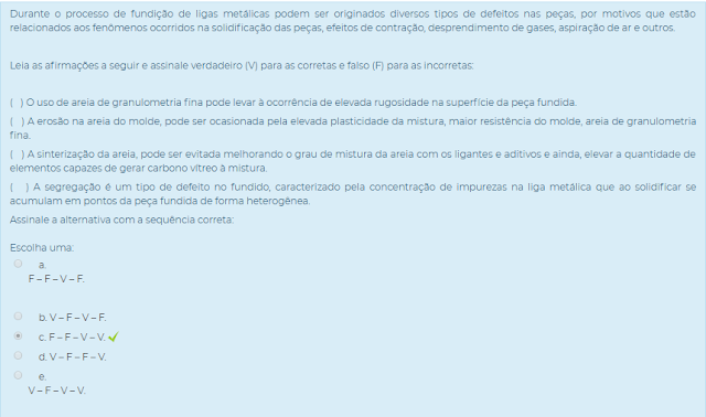 ( ) Uma forma de melhorar o acabamento da peça fundida é a utilização de areia de granulação mais fina.