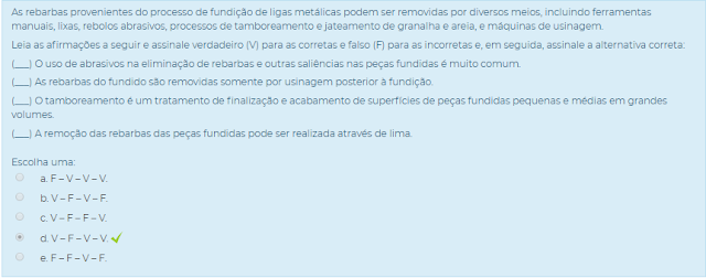 (___) O uso de abrasivos na eliminação de rebarbas e outras saliências nas peças fundidas é muito comum.
