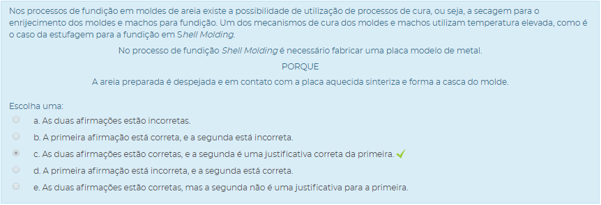 (___) As areias para fundição Shell Molding, utilizam resinas apropriadas mais um catalizador, que combinados com a temperatura das estufas tornam o molde rígido.