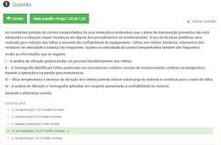1 As constantes paradas da correia transportadora de uma mineradora evidenciam que o plano de manutenção preventiva não está adequado e a situação requer mudanças em alguns dos procedimentos de monitoramento. O uso de técnicas preditivas será realizado para redução das falhas e aumento da confiabilidade do equipamento. Falhas nos roletes, tambores, rolamentos dos redutores de velocidade e balança são frequentes. Ajustes na velocidade da correia transportadora também são frequentes.