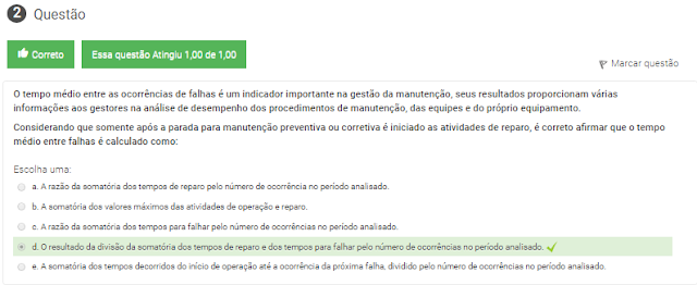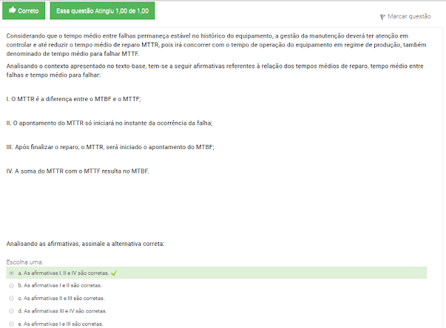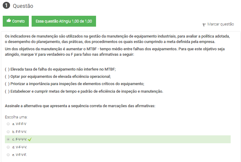 Um dos objetivos da manutenção é aumentar o MTBF - tempo médio entre falhas dos equipamentos. Para que este objetivo seja atingido, marque V para verdadeiro ou F para falso nas afirmativas a seguir: