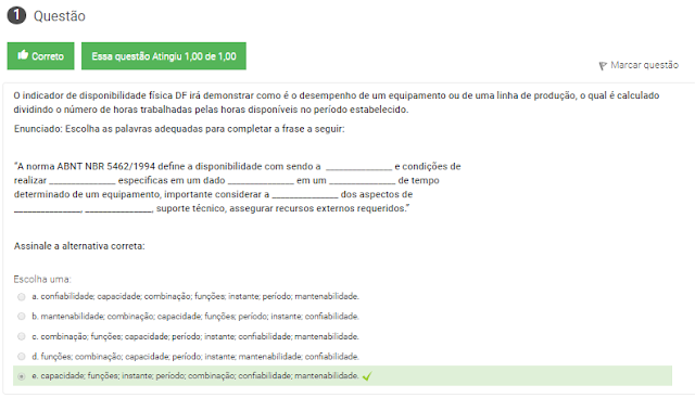 “A norma ABNT NBR 5462/1994 define a disponibilidade com sendo a _______________ e condições de realizar _______________ especificas em um dado _______________ em um _______________ de tempo determinado de um equipamento, importante considerar a _______________ dos aspectos de _______________, _______________, suporte técnico, assegurar recursos externos requeridos.”