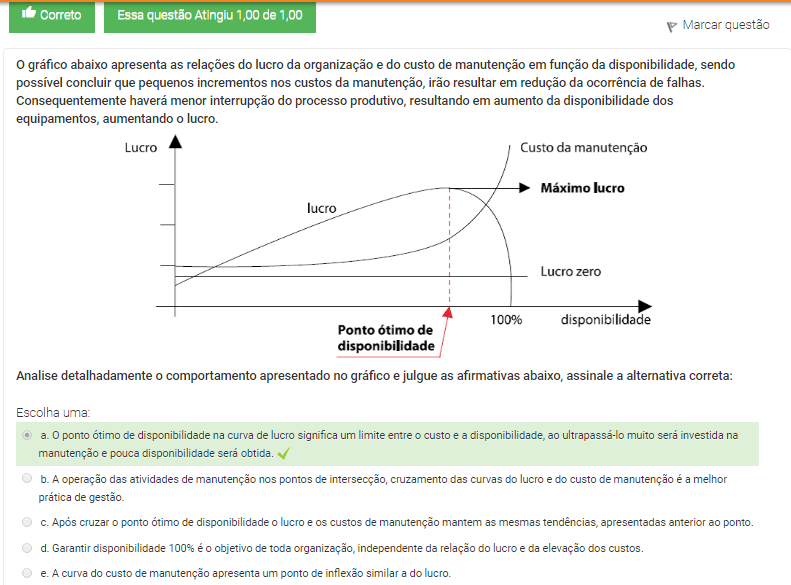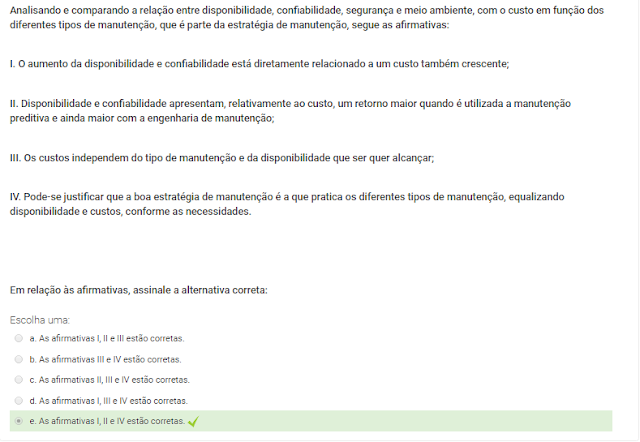 Analisando e comparando a relação entre disponibilidade, confiabilidade, segurança e meio ambiente, com o custo em função dos diferentes tipos de manutenção, que é parte da estratégia de manutenção, segue as afirmativas: