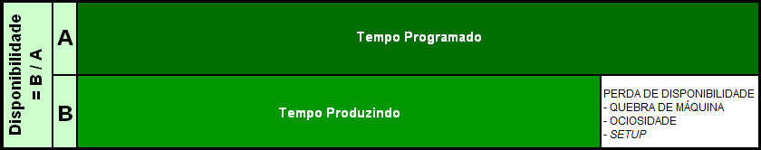 3 Garantir a disponibilidade física do equipamento é um dos principais objetivos da manutenção industrial, utilizando paradas programadas, evitando assim as paradas não programadas. Na figura a seguir, as barras A e B representam o tempo programado e o tempo produzindo, descontando as perdas por quebras, ociosidade e setup (preparação do equipamento).