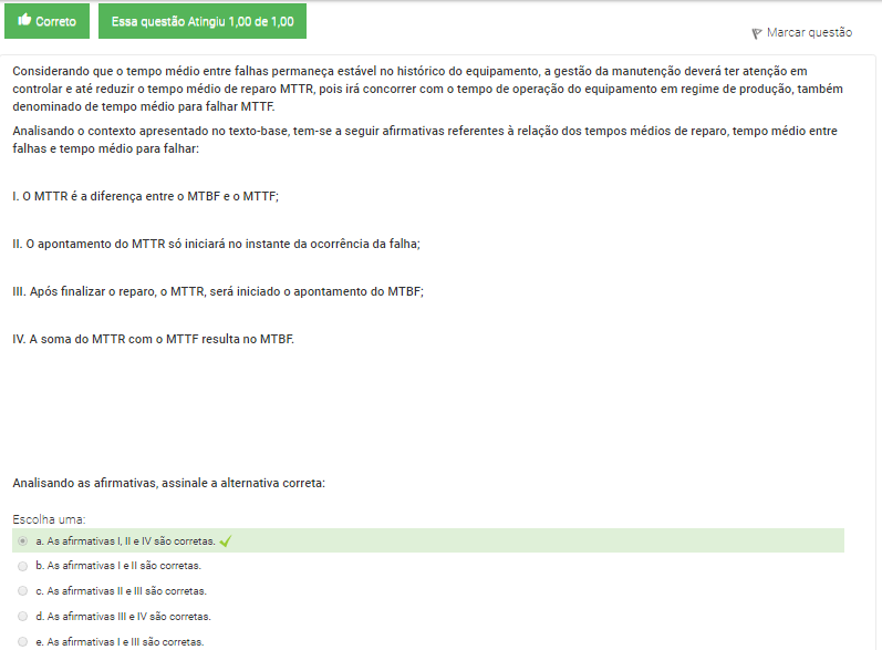 Analisando o contexto apresentado no texto-base, tem-se a seguir afirmativas referentes à relação dos tempos médios de reparo, tempo médio entre falhas e tempo médio para falhar: