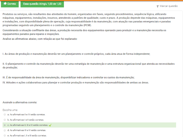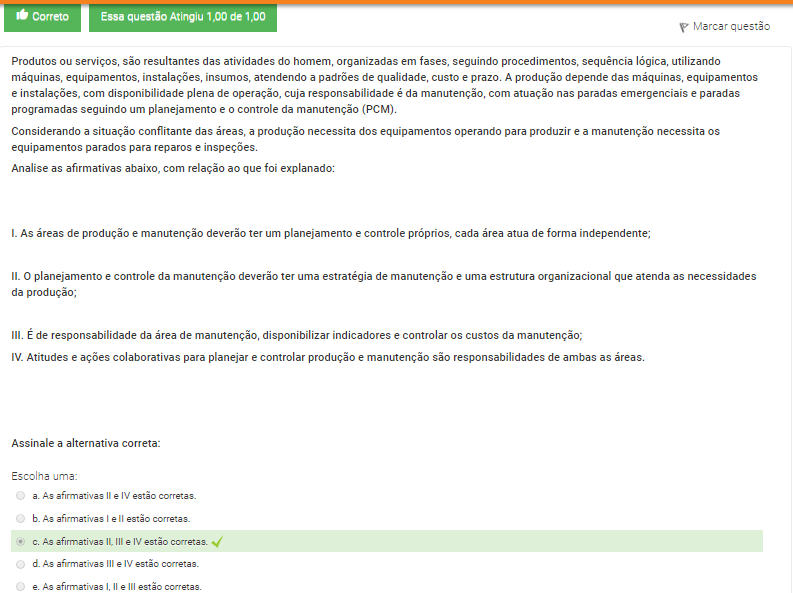 IV. A adoção da manutenção detectiva, corretiva planejada e engenharia de manutenção, pode demonstrar adoção de conceitos de manutenção e exigência de novos equipamentos.