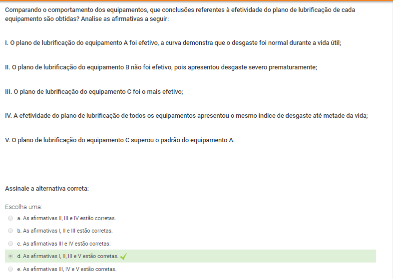 IV. A efetividade do plano de lubrificação de todos os equipamentos apresentou o mesmo índice de desgaste até metade da vida;