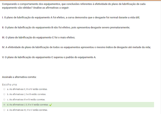 Comparando o comportamento dos equipamentos, que conclusões referentes à efetividade do plano de lubrificação de cada equipamento são obtidas? Analise as afirmativas a seguir: