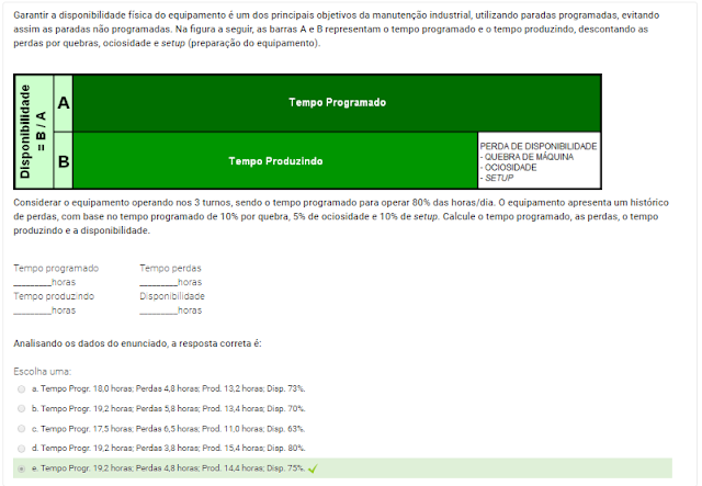 Considerar o equipamento operando nos 3 turnos, sendo o tempo programado para operar 80% das horas/dia. O equipamento apresenta um histórico de perdas, com base no tempo programado de 10% por quebra, 5% de ociosidade e 10% de setup. Calcule o tempo programado, as perdas, o tempo produzindo e a disponibilidade.