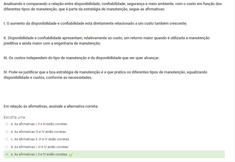 IV. Pode-se justificar que a boa estratégia de manutenção é a que pratica os diferentes tipos de manutenção, equalizando disponibilidade e custos, conforme as necessidades.