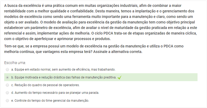 Tem-se que, se a empresa possui um modelo de excelência na gestão da manutenção e utiliza o PDCA como melhoria contínua, que vantagens esta empresa terá? Assinale a alternativa correta.