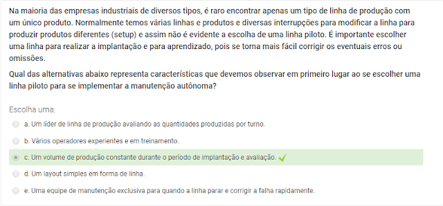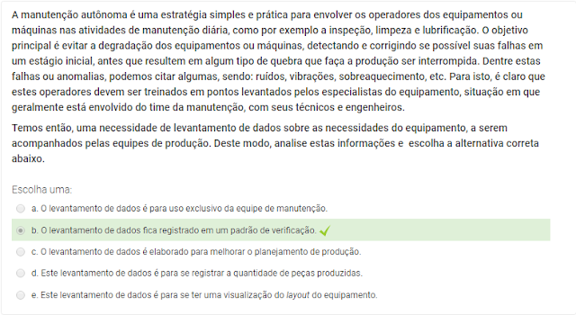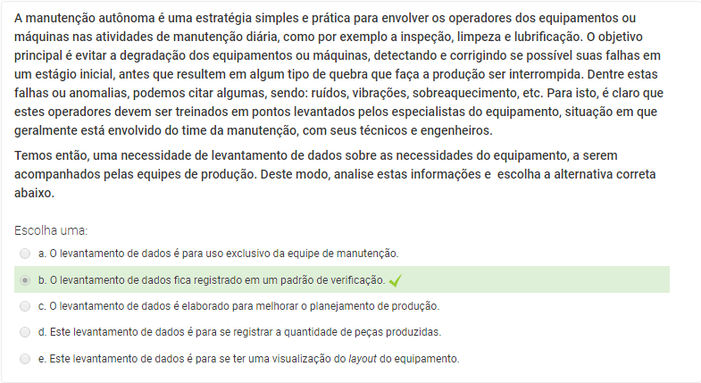 A partir do entendimento sobre o que é a manutenção autônoma, avalie as alternativas a seguir e assinale a que define a manutenção autônoma.