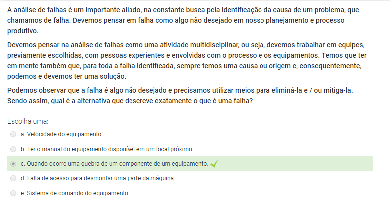 Sabendo que a falha é algo não desejado em um processo de produção contínua, e que a manutenção centrada na confiabilidade é necessária para assegurar que os equipamentos trabalhem sem falhas, analise esta afirmação e assinale a alternativa correta.