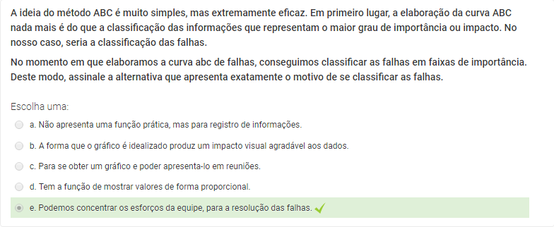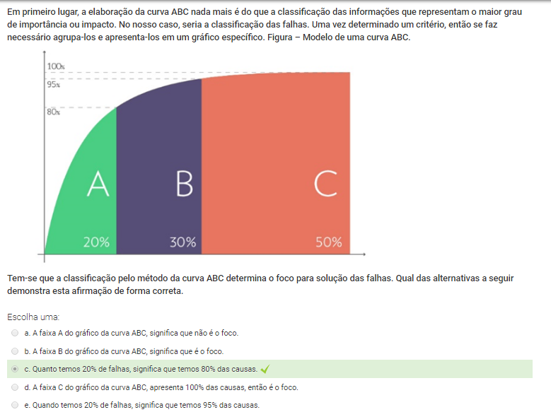 Tem-se que a classificação pelo método da curva ABC determina o foco para solução das falhas. Qual das alternativas a seguir demonstra esta afirmação de forma correta.