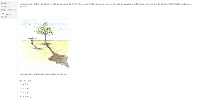 1 Um homem de 1,80 m de altura projeta uma sombra de 2,70 m de comprimento no mesmo instante em que uma árvore projeta uma sombra de 9 m de comprimento. Qual é a altura da árvore?