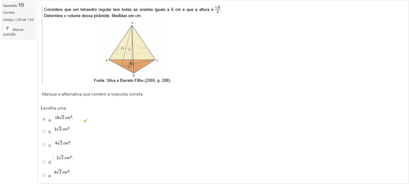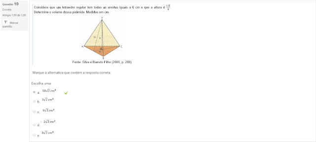 10 Considere que um Tetraedro regular tem todas as arestas iguais a 6 cm e que a altura...