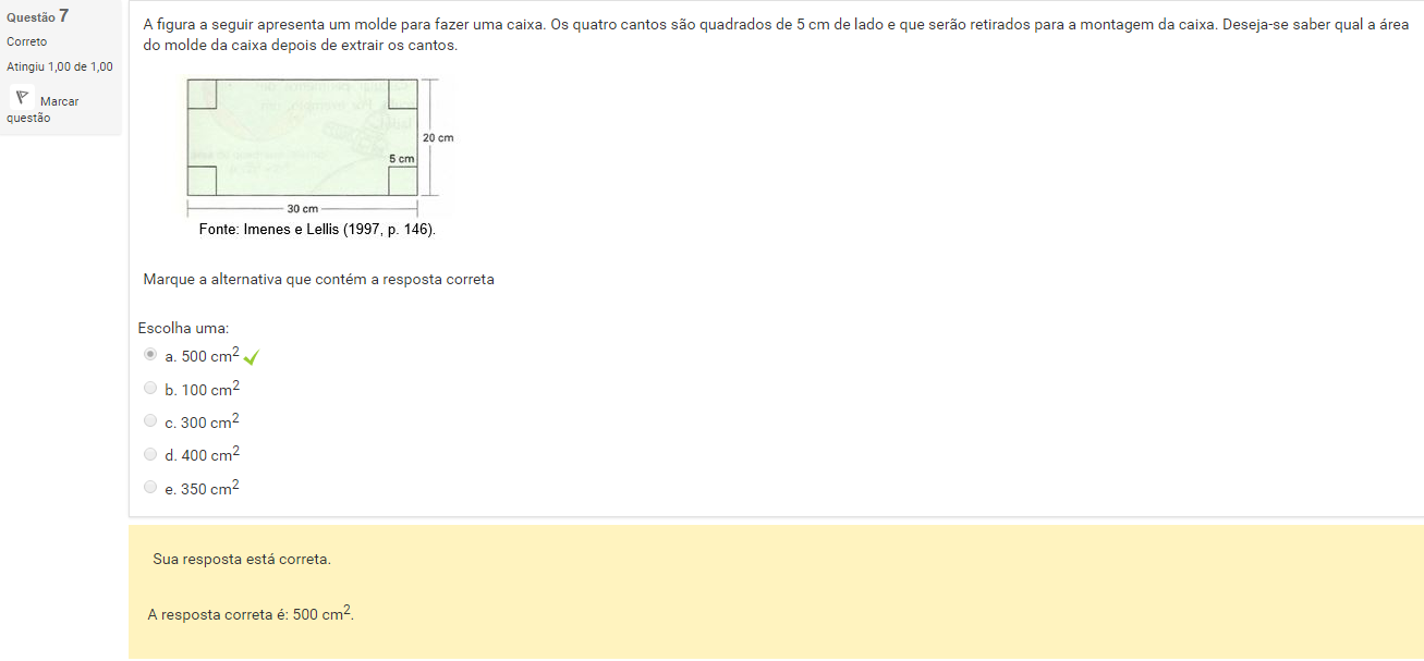 7 A figura a seguir apresenta um molde para fazer uma caixa. Os quatro cantos são quadrados de 5 cm de lado e que serão retirados para a montagem da caixa. Deseja-se saber qual a área do molde da caixa depois de extrair os cantos.