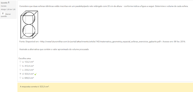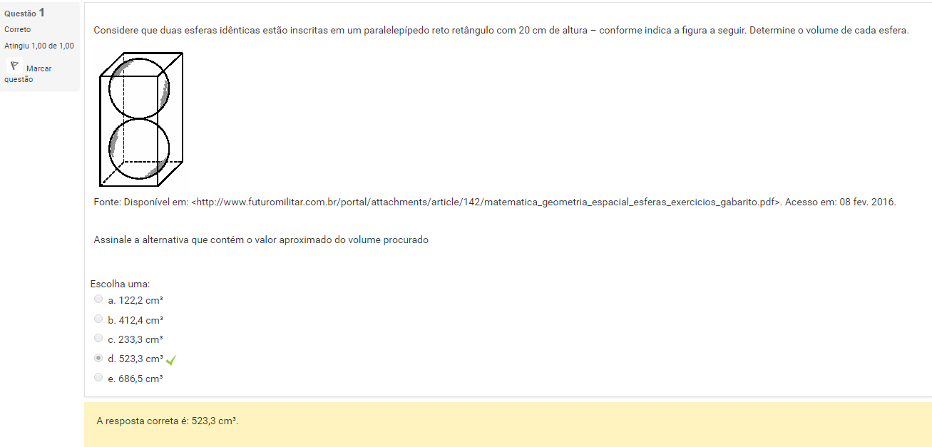 1 Considere que duas esferas idênticas estão inscritas em um paralelepípedo reto retângulo com 20 cm de altura – conforme indica a figura a seguir. Determine o volume de cada esfera.
