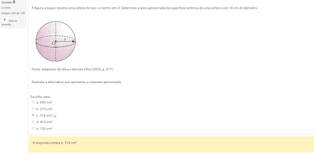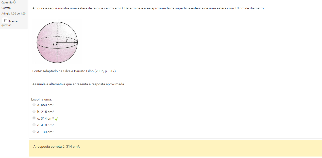 8 A figura a seguir mostra uma esfera de raio r e centro em O. Determine a área aproximada da superfície esférica de uma esfera com 10 cm de diâmetro.