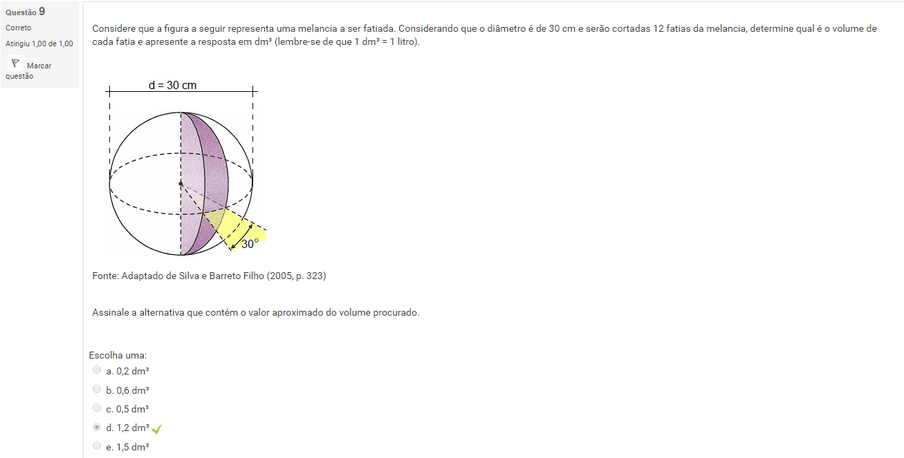 9 Considere que a figura a seguir representa uma melancia a ser fatiada. Considerando que o diâmetro é de 30 cm e serão cortadas 12 fatias da melancia, determine qual é o volume de cada fatia e apresente a resposta em dm³ (lembre-se de que 1 dm³ = 1 litro).