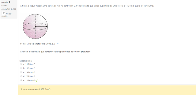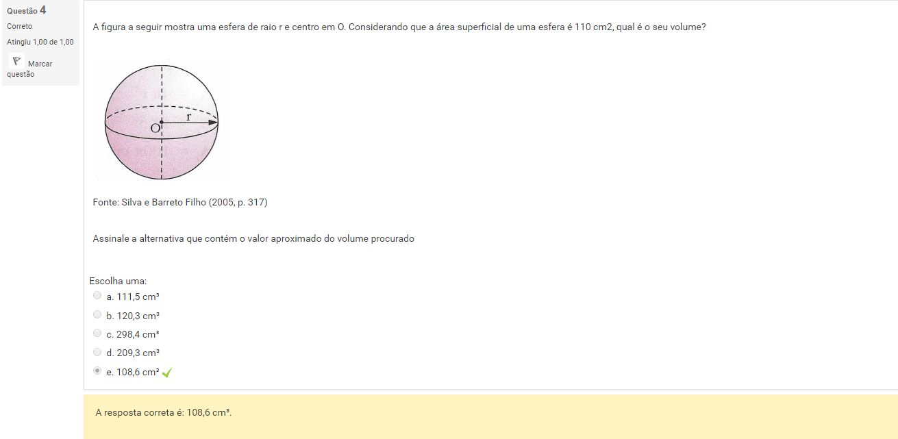 4 A figura a seguir mostra uma esfera de raio r e centro em O. Considerando que a área superficial de uma esfera é 110 cm2, qual é o seu volume?