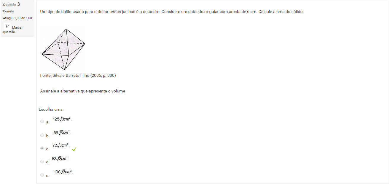 3 Um tipo de balão usado para enfeitar festas juninas é o octaedro. Considere um octaedro regular com aresta de 6 cm. Calcule a área do sólido.
