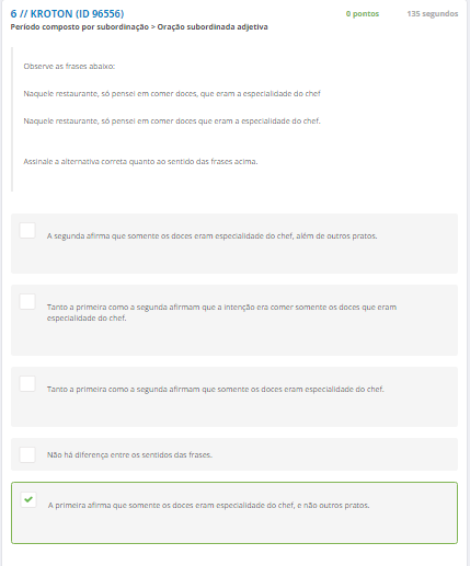 6 Observe as frases abaixo: Naquele restaurante, só pensei em comer doces, que eram a especialidade do chef. Naquele restaurante, só pensei em comer doces que eram a especialidade do chef Assinale a alternativa correta quanto ao sentido das frases acima. Escolha uma:
