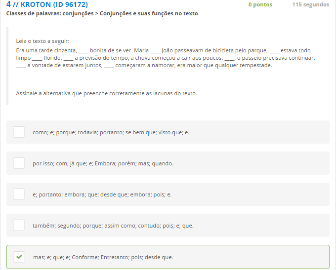 Era uma tarde cinzenta, ____ bonita de se ver. Maria ____ João passeavam de bicicleta pelo parque, ____ estava todo limpo ____ florido. ____ a previsão do tempo, a chuva começou a cair aos poucos. ____, o passeio precisava continuar, ____ a vontade de estarem juntos, ____ começaram a namorar, era maior que qualquer tempestade.