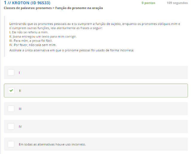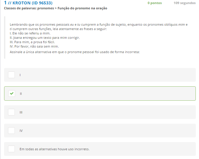 1 Lembrando que os pronomes pessoais eu e tu cumprem a função de sujeito, enquanto os pronomes oblíquos mim e ti cumprem outras funções, leia atentamente as frases a seguir: I. Ele não se referiu a mim. II. Joana entregou um texto para mim corrigir. III. Para mim, a prova foi fácil. IV. Por favor, não saia sem mim. Assinale a única alternativa em que o pronome pessoal foi usado de forma incorreta: Escolha uma