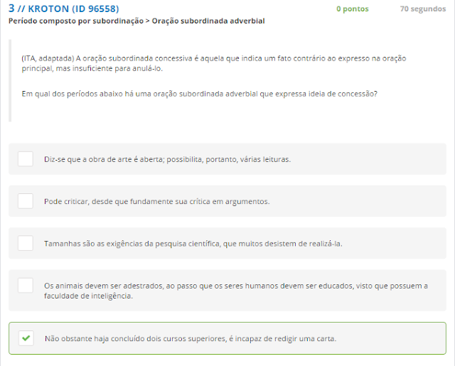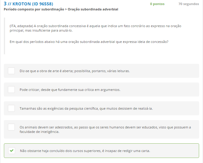 3 (ITA, adaptada) A oração subordinada concessiva é aquela que indica um fato contrário ao expresso na oração principal, mas insuficiente para anulá-lo. Em qual dos períodos abaixo há uma oração subordinada adverbial que expressa ideia de concessão?