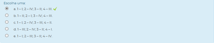 d. 1 – III; 2 – IV; 3 – II; 4 – I.
