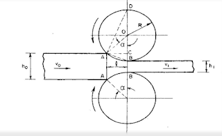 3) Se considerarmos a forma mais simples conhecida para o processo de Laminação, podemos elencar algumas características muito particulares. A sua definição indica que o metal deve passar no meio de dois cilindros de forma forçada e que estes cilindros estão dispostos a uma distância menor que a espessura da peça que vai ser deformada e que a deformação plástica do metal ocorre durante a passagem pelos cilindros.