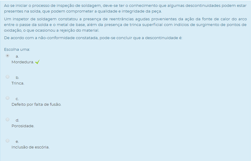 Um inspetor de soldagem constatou a presença de reentrâncias agudas provenientes da ação da fonte de calor do arco entre o passe da solda e o metal de base, além da presença de trinca superficial com indícios de surgimento de pontos de oxidação, o que ocasionou a rejeição do material.