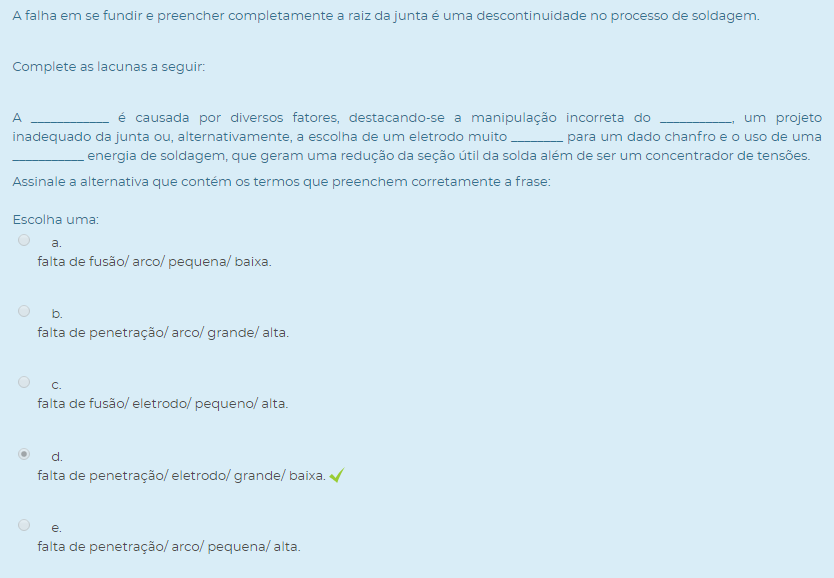 A ____________ é causada por diversos fatores, destacando-se a manipulação incorreta do ___________, um projeto inadequado da junta ou, alternativamente, a escolha de um eletrodo muito ________ para um dado chanfro e o uso de uma ___________ energia de soldagem, que geram uma redução da seção útil da solda além de ser um concentrador de tensões.