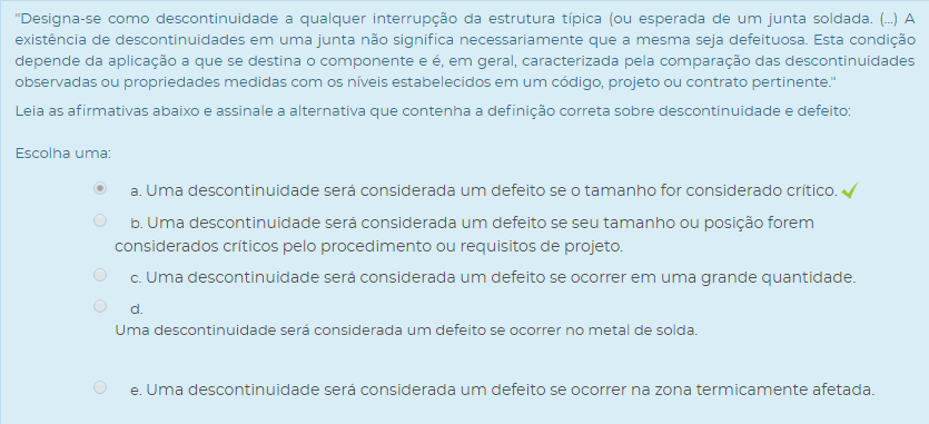 1) "Designa-se como descontinuidade a qualquer interrupção da estrutura típica (ou esperada de um junta soldada. (...) A existência de descontinuidades em uma junta não significa necessariamente que a mesma seja defeituosa. Esta condição depende da aplicação a que se destina o componente e é, em geral, caracterizada pela comparação das descontinuidades observadas ou propriedades medidas com os níveis estabelecidos em um código, projeto ou contrato pertinente."