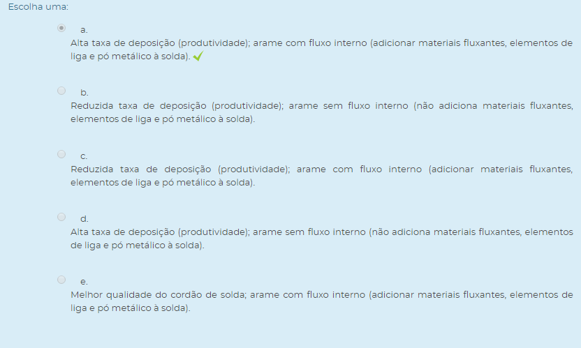( ) Neste processo o valor da corrente e da tensão são altos, o que significa alta temperatura, fusão, e velocidade de soldagem, com isso, a ZTA é grande, e proporciona um acabamento ruim no cordão de solda.