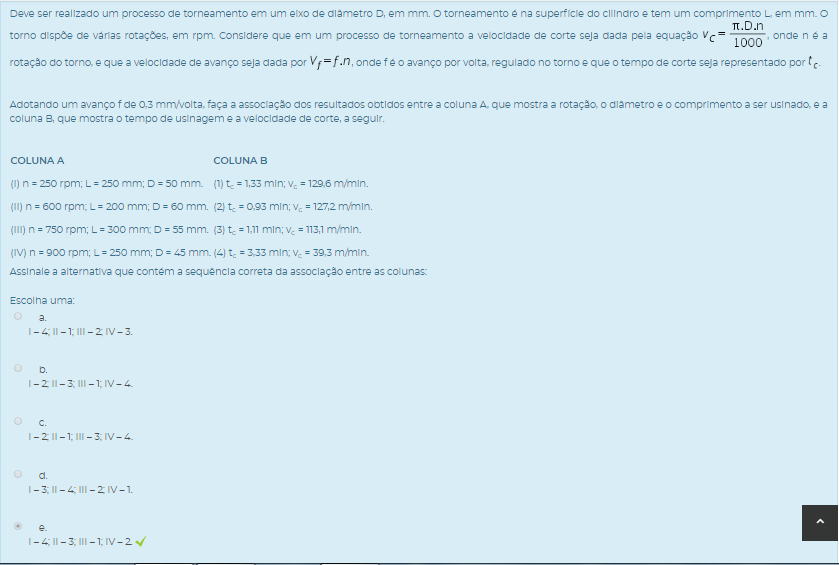 Adotando um avanço f de 0,3 mm/volta, faça a associação dos resultados obtidos entre a coluna A, que mostra a rotação, o diâmetro e o comprimento a ser usinado, e a coluna B, que mostra o tempo de usinagem e a velocidade de corte, a seguir.