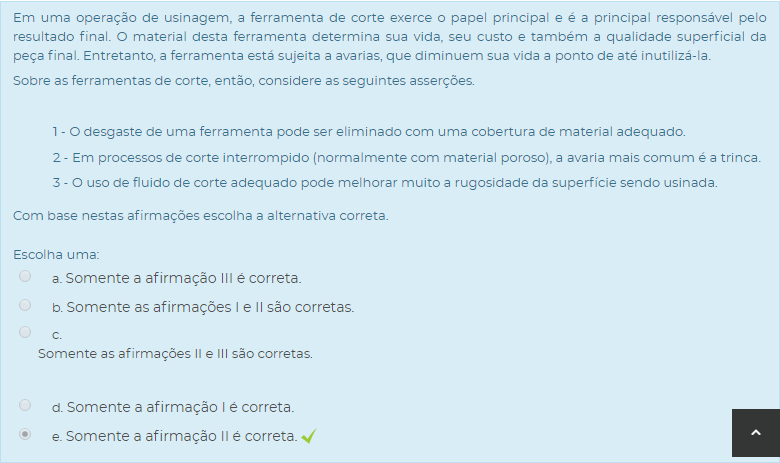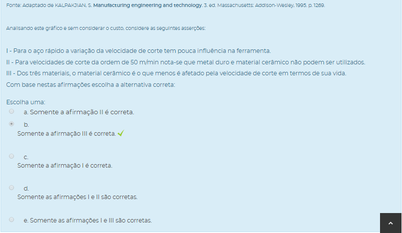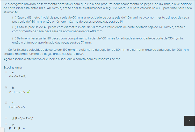 Se o desgaste máximo na ferramenta admissível para que ela ainda produza bom acabamento na peça é de 0,4 mm, e a velocidade de corte ideal está entre 110 e 140 m/min, então analise as afirmações a seguir e marque V para verdadeiro ou F para falso para cada afirmação.