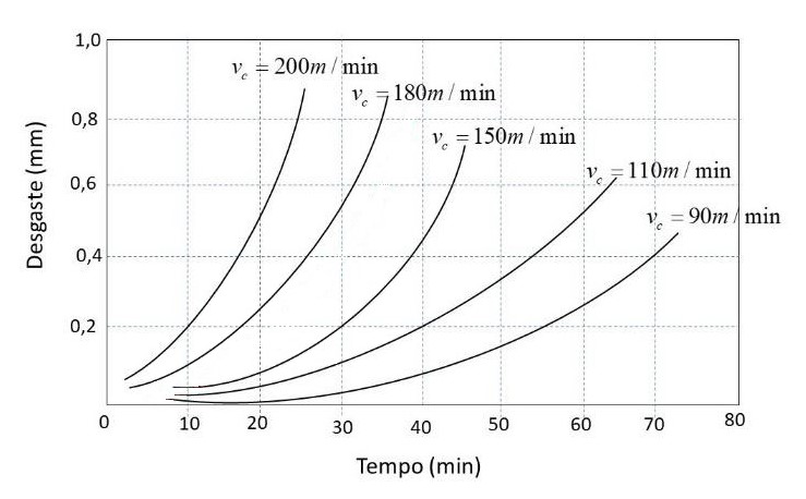 1) Ao utilizar uma ferramenta de corte ela se desgasta naturalmente. E a vida da ferramenta acaba quando a qualidade da peça produzida cai abaixo de determinados parâmetros pré-estabelecidos. A partir daí a ferramenta deverá ser substituída e poderá passar por uma afiação, se viável. Foram feitos ensaios com ferramentas de aço rápido, metal duro e material cerâmico, visando determinar a vida da ferramenta na usinagem de um determinado tipo de aço. Os resultados são mostrados no gráfico a seguir.