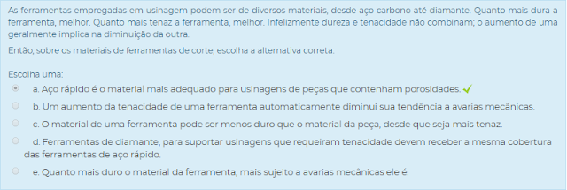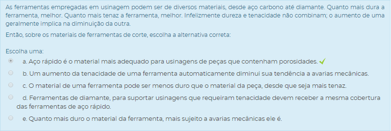 2) As ferramentas empregadas em usinagem podem ser de diversos materiais, desde aço carbono até diamante. Quanto mais dura a ferramenta, melhor. Quanto mais tenaz a ferramenta, melhor. Infelizmente dureza e tenacidade não combinam; o aumento de uma geralmente implica na diminuição da outra.