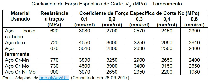 , onde Ap é a profundidade de corte, Ae é a largura de corte, Vf é a velocidade de avanço da mesa, Kc é o coeficiente de força específica de corte e η é o rendimento da máquina. O coeficiente Kc para este caso é dado pela seguinte tabela resumida: