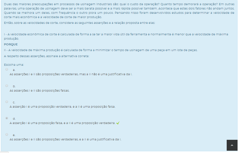 I - A velocidade econômica de corte é calculada de forma a se ter a maior vida útil da ferramenta e normalmente é menor que a velocidade de máxima produção.
