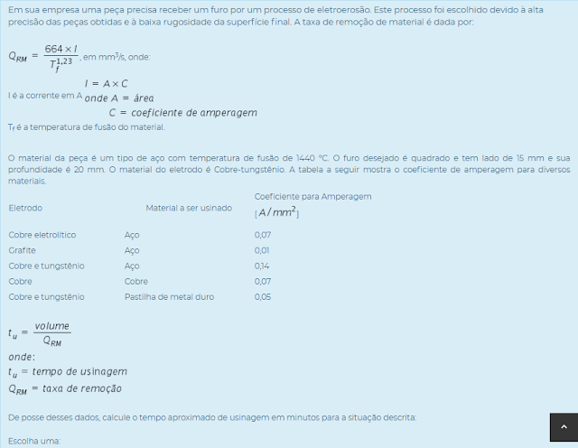 1) Entre os processos de usinagem não convencionais existe um muito empregado que é a eletroerosão. Este processo opera com descargas elétricas intensas que aquecem a região da peça considerada e a derretem.