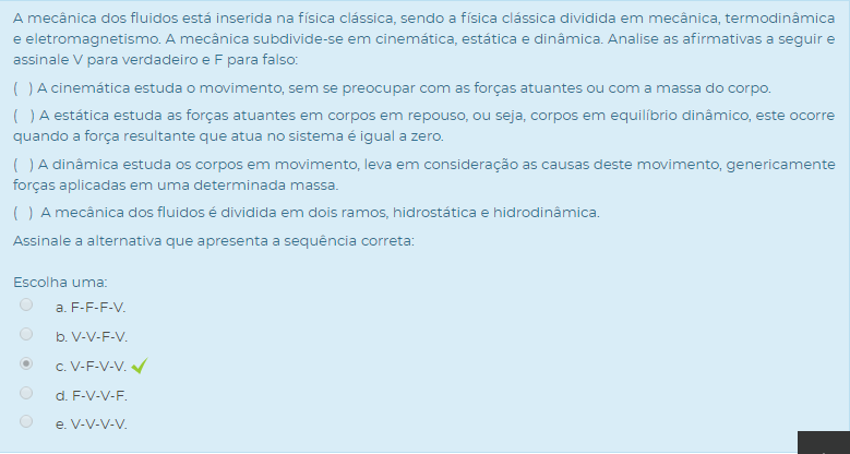 ( ) A mecânica dos fluidos é dividida em dois ramos, hidrostática e hidrodinâmica.