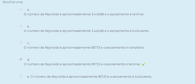 O número de Reynolds em um escoamento de água é de 1994, sabendo-se que o diâmetro do tubo mede 10 cm, a viscosidade dinâmica da água é de 1,0030 x 10 -3 Pa.s e a massa especifica da água é 1.000 Kg/m³.