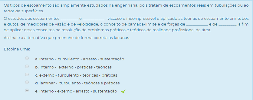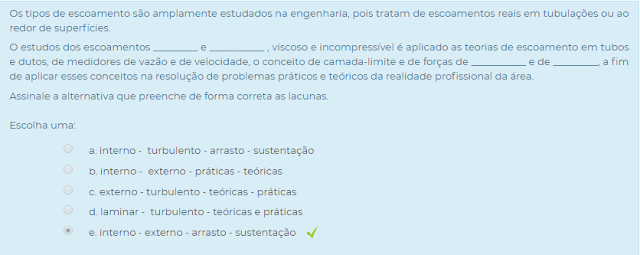 O estudos dos escoamentos _________ e ___________ , viscoso e incompressível é aplicado as teorias de escoamento em tubos e dutos, de medidores de vazão e de velocidade, o conceito de camada-limite e de forças de ___________ e de _________, a fim de aplicar esses conceitos na resolução de problemas práticos e teóricos da realidade profissional da área.